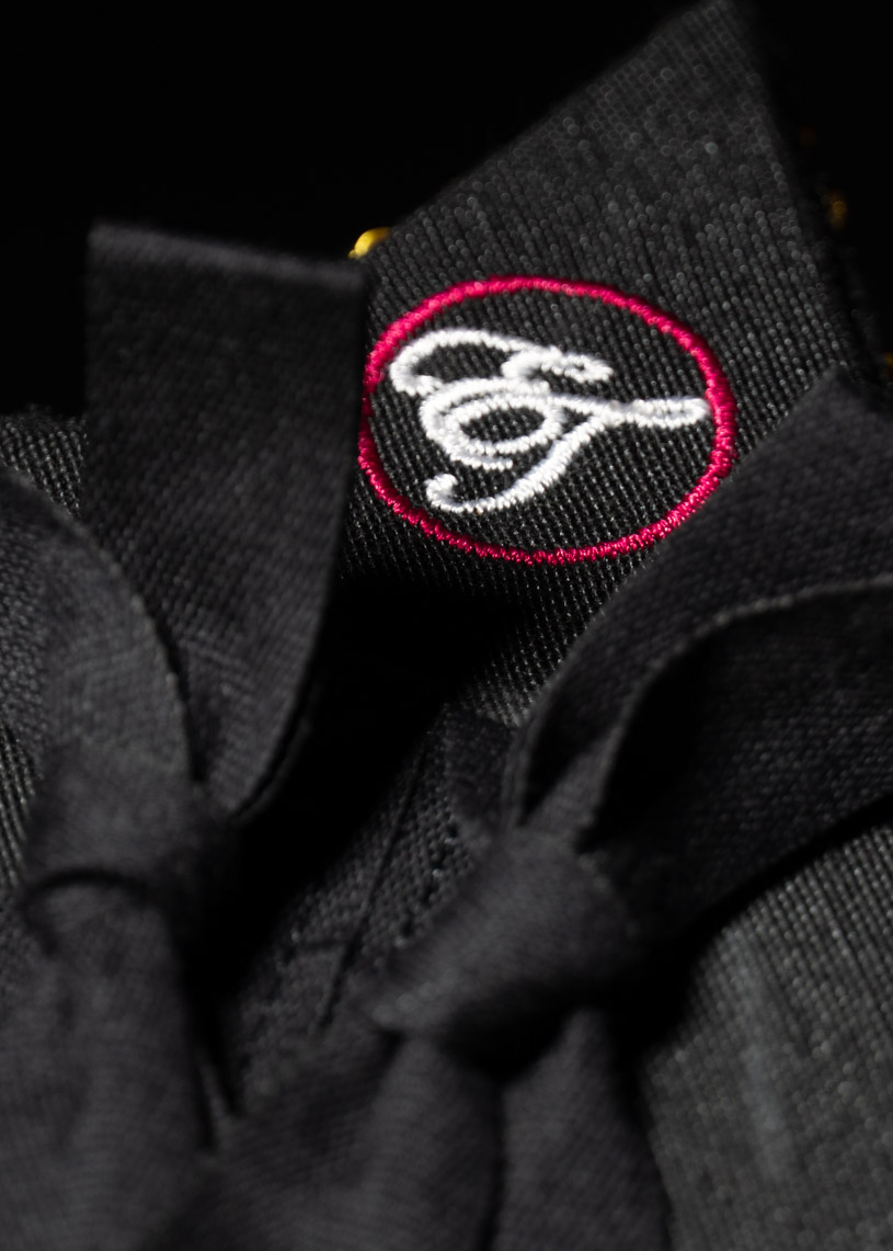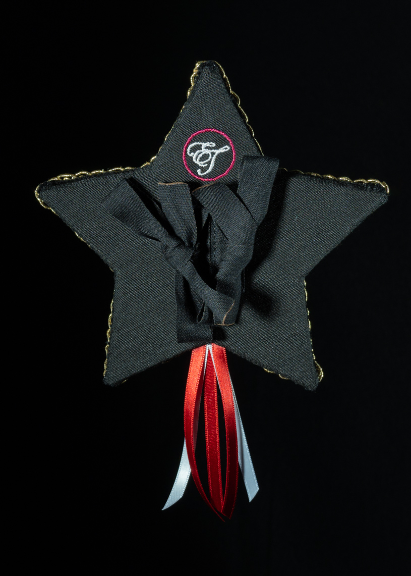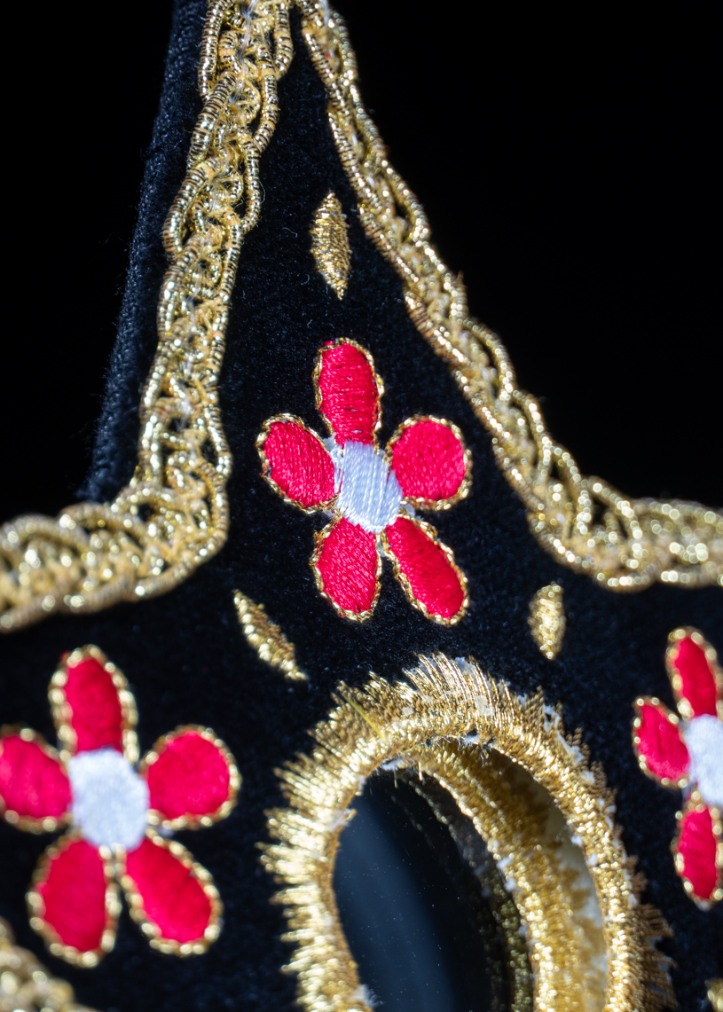 Confeccionado a mano, el Estel dorado con flores rojas tiene forma de estrella de cinco puntas y está elaborado sobre una base de terciopelo negro, con un espejo circular en el centro. Su contorno está realzado con un galón dorado que enmarca y resalta su silueta con elegancia, y un bordado dorado recubre y protege al espejo.