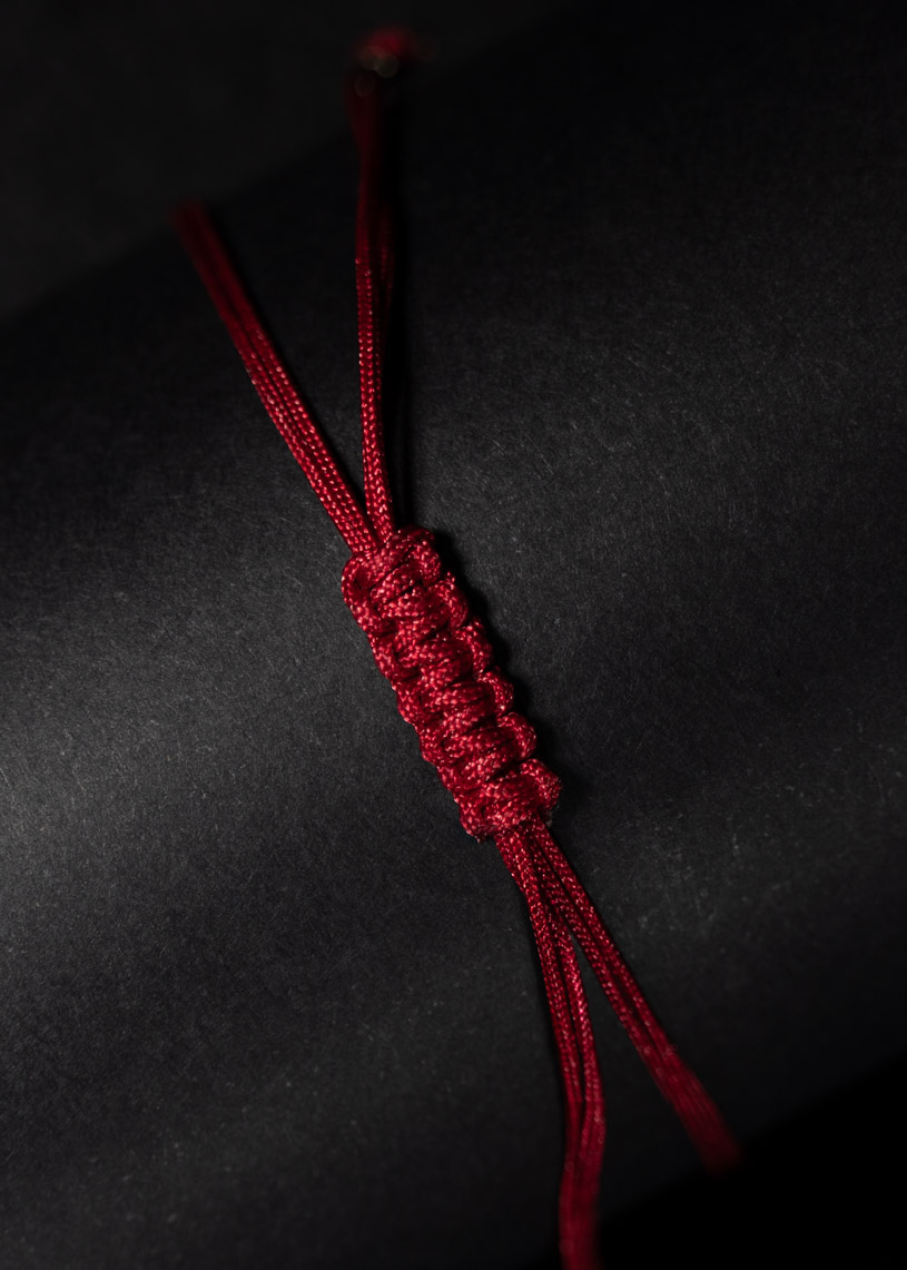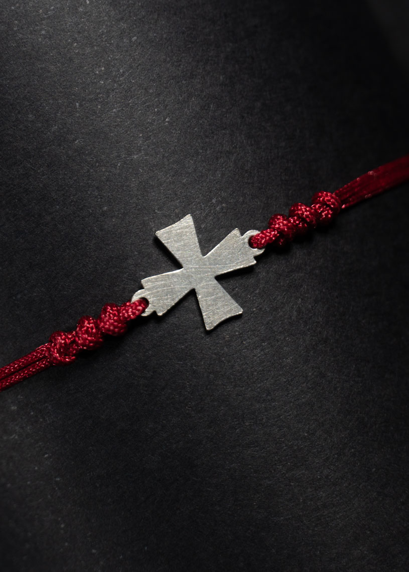 Cada pieza está elaborada artesanalmente en Menorca con Plata de ley 925 e hilo encerado en color rojo, e incorpora tres nudos embellecedores en los extremos de la cruz, que mide 10 mm de largo y 10 mm de alto. El cierre corredizo en macramé permite un ajuste perfecto y cómodo, mientras que los detalles finales con bolitas decorativas aportan un acabado cuidado.